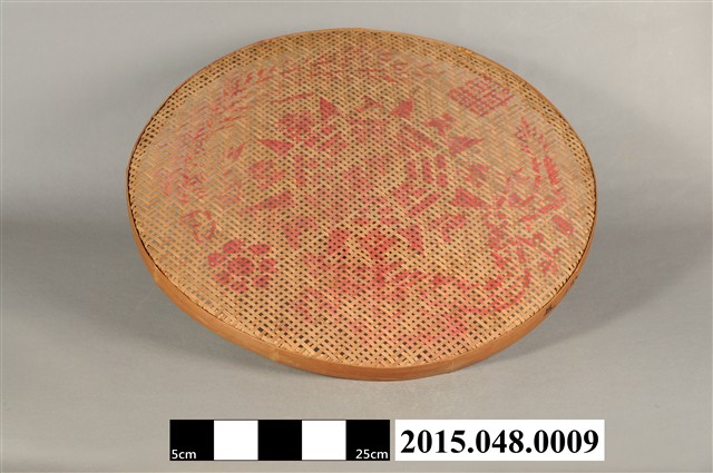 2. 本件八卦米篩以竹篾編成,於米篩正面噴塗紅色朱漆,朱漆圖案略為模糊,中央為一八卦圖案,八卦內中央書寫太極二字,上下左右環繞天定、添丁、良緣、進財等吉祥詞彙。八卦圖案正上方為一雙囍字,左右側圍繞鳳凰與龍圖騰。
