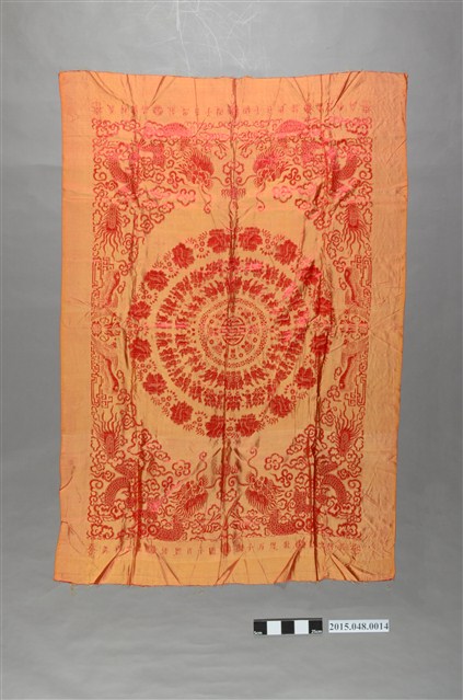 本件喜幛為紅色與金色紗線織成之雙色緹花布,材質柔軟光滑,推測為絲質,共有2件相同喜幛。喜幛正面為正紅底色搭配金色圖紋,正中央為一圓形壽字,外層環繞2圈百子及1圈牡丹花紋,百子圖上下環繞龍、鳳凰、雲紋等,夠成龍鳳百子圖,象徵祝賀新人富貴吉祥、早生貴子。布料上下邊皆有「泰山 義祥出品 龍鳳百子圖」等金色緹花字。喜幛背面則與正面顏色相反,為淺橙色底紅色字紋。