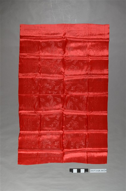 本件喜幛為紅色紗線織成之單色緹花布,材質柔軟光滑,推測為絲質,喜幛織有許多圓形雙囍字。共計有6件,推測為較傳統的喜幛形式。