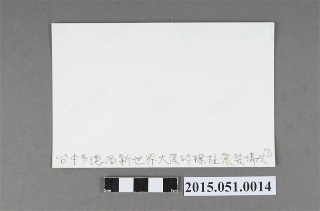 本件為4X6吋照片,柯達(Kodak)相紙沖印,影像內容為1999年9月21日921地震發生,導致臺中市南區五權南路上剛落成的德昌新世界電梯大廈,樑柱震裂,幾乎被震垮,也造成4名居民死亡,後來被公共工程委員會勘驗認定為全倒的建物。拍攝者與拍攝日期不詳。 背面書寫有「台中市德昌新世界大廈的樑柱震裂情況①」說明文字。