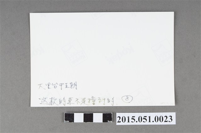 本件為4X6吋照片,柯達(Kodak)相紙沖印,影像內容為1999年9月21日921地震發生,導致臺中縣大里市(現為臺中市大里區)臺中王朝社區大樓的2棟大樓倒塌,當時連停放在附近的車輛都被壓扁。拍攝者與拍攝日期不詳。 背面書寫有「大里台中王朝這款的車不是撞到的⑧」說明文字。