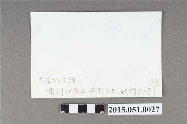 本件為4X6吋照片,柯達(Kodak)相紙沖印,影像內容為1999年9月21日921地震發生,導致臺中縣大里市(現為臺中市大里區)臺中王朝社區大樓的2棟大樓倒塌,傾斜的大樓則緊急先以鋼架支撐臨時加固。拍攝者與拍攝日期不詳。 背面書寫有「大里台中王朝:請到此為止,再倒下來,我們也垮了(12)」說明文字。