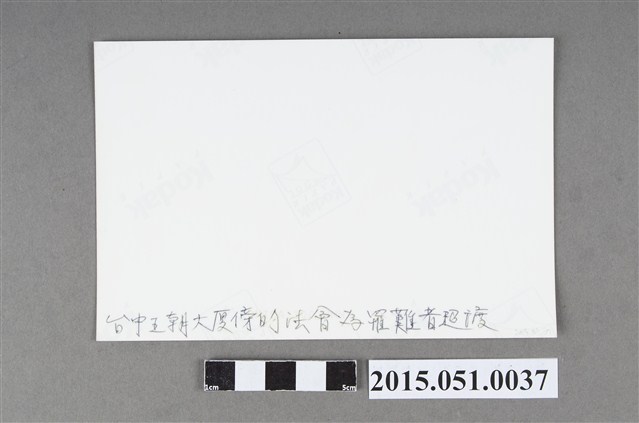 本件為4X6吋照片,柯達(Kodak)相紙沖印,影像內容為1999年9月21日921地震發生,導致臺中縣大里市(現為臺中市大里區)臺中王朝社區大樓的2棟大樓倒塌,災後辦理「啟建九二一安靈息災超薦大法會」,超渡921地震罹難者。拍攝者與拍攝日期不詳。 背面書寫有「台中王朝大廈傍的法會為罹難者超渡」說明文字。