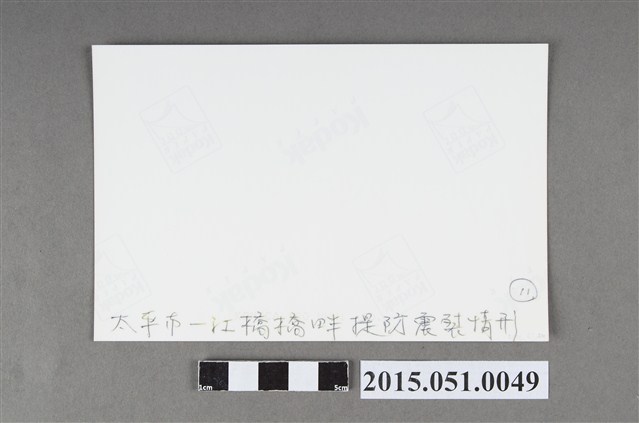 本件為4X6吋照片,柯達(Kodak)相紙沖印,影像內容為1999年9月21日921地震發生,導致臺中縣太平市(現為臺中市太平區)的一江橋,橫跨頭汴坑溪的橋面斷裂成好幾段,連茶寮堤防也震裂。拍攝者與拍攝日期不詳。 背面書寫有「太平市一江橋橋畔提(堤)防震裂情形(11)」說明文字。