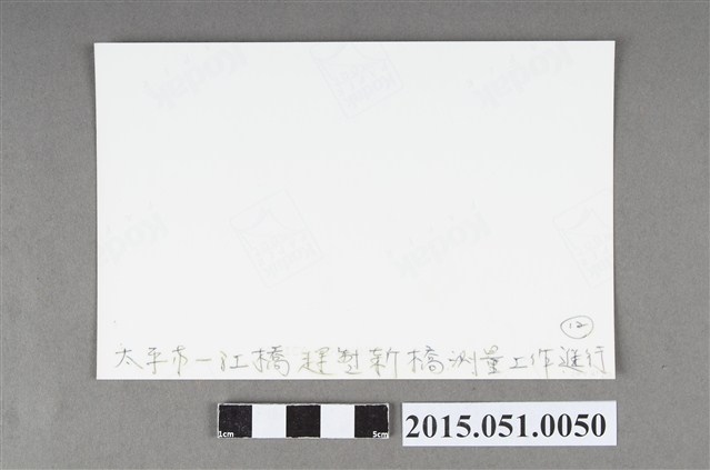 本件為4X6吋照片,柯達(Kodak)相紙沖印,影像內容為1999年9月21日921地震發生,導致臺中縣太平市(現為臺中市太平區)的一江橋,橫跨頭汴坑溪的橋面位移隆起而損毀,斷成好幾段,於2000年10月開始重建,2001年4月改建完成。拍攝者與拍攝日期不詳。 背面書寫有「太平市一江橋趕製新橋測量工作進行(12)」說明文字。