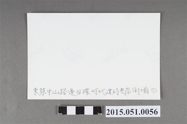 本件為4X6吋照片,柯達(Kodak)相紙沖印,影像內容為1999年9月21日921地震發生,使得臺中縣東勢鎮(現為臺中市東勢區)成了重災區,連中山路上日治時期興建的連棟街屋也倒塌了。拍攝者與拍攝日期不詳。 背面書寫有「東勢中山路邊日據時代建的老店倒塌①」說明文字。