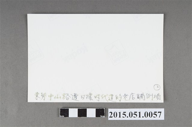 本件為4X6吋照片,柯達(Kodak)相紙沖印,影像內容為1999年9月21日921地震發生,使得臺中縣東勢鎮(現為臺中市東勢區)成了重災區,連中山路上日治時期興建的連棟街屋也倒塌了。拍攝者與拍攝日期不詳。 背面書寫有「東勢中山路邊日據時代建的老店舖倒塌②」說明文字。