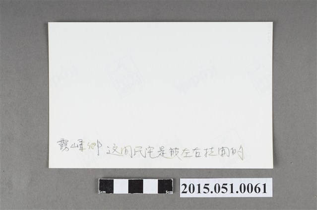 本件為4X6吋照片,柯達(Kodak)相紙沖印,影像內容為1999年9月21日921地震發生,使得臺中縣霧峰鄉(現為臺中市霧峰區)多處房屋倒塌,受創嚴重。拍攝者與拍攝日期不詳。 背面書寫有「霧峰鄉這間民宅是被左右拉開的」說明文字。