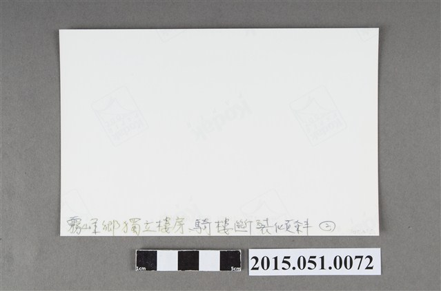 本件為4X6吋照片,柯達(Kodak)相紙沖印,影像內容為1999年921震災,臺中縣霧峰鄉(現為臺中市霧峰區)一棟樓房的騎樓柱子被震得位移傾斜的情形。拍攝者與拍攝日期不詳。 背面書寫有「霧峰鄉獨立樓房騎樓震斷傾斜②」說明文字。