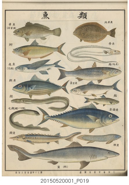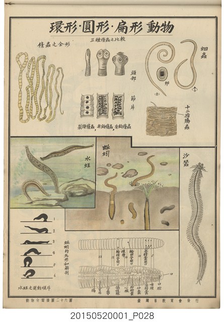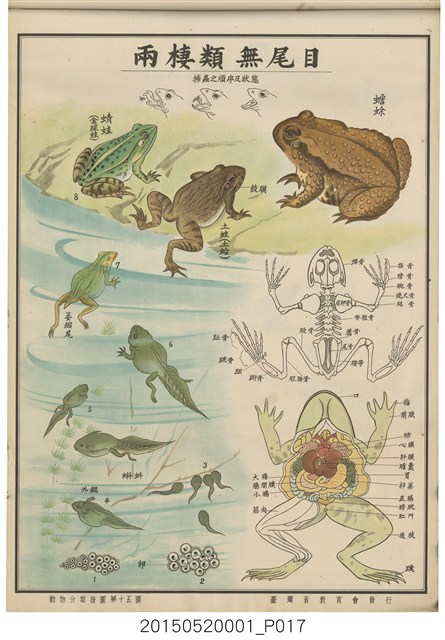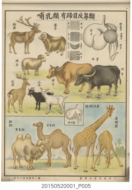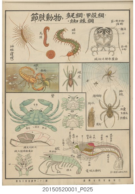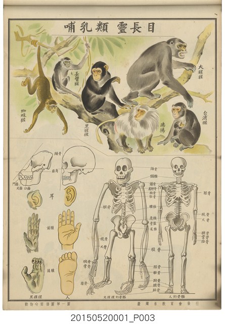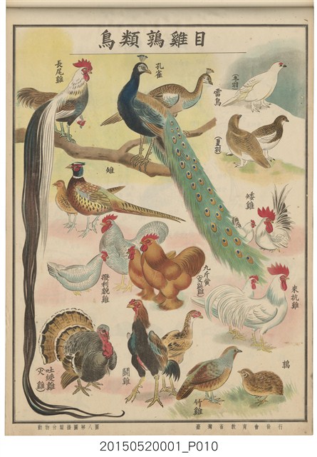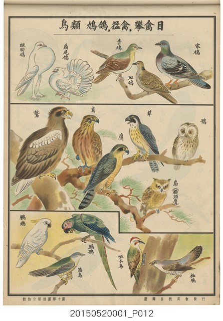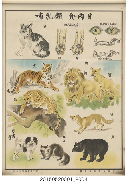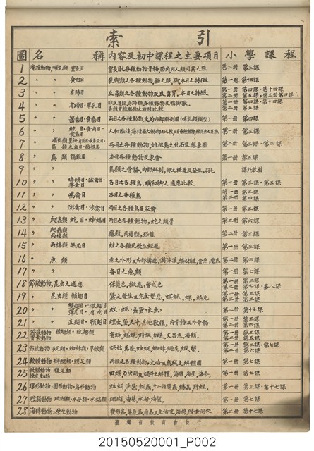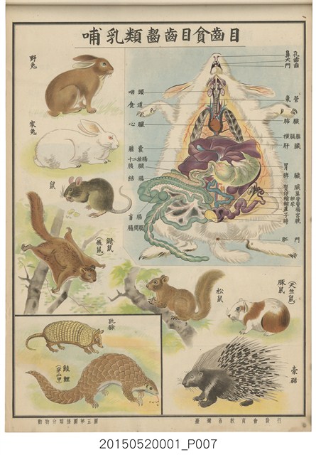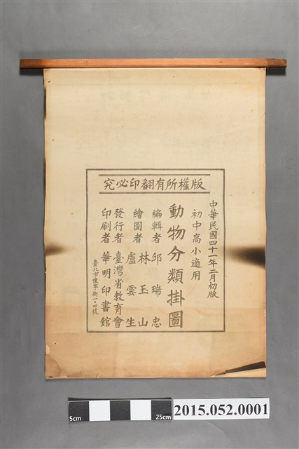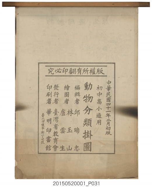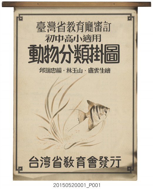 封面註明「臺灣省教育廳審訂」、「初中.高小適用」、「動物分類掛圖」、「邱瑞忠編.林玉山.盧雲生繪」,一組30頁,民國41年2月初版。除封面、索引外共計28張各動物類別繪圖,索引標示各圖與初中、國小教科書章節關聯。林玉山為台灣日治時期中的台灣代表畫家之一,以膠彩畫及水墨畫著稱,盧雲生與林玉山為師徒,兩人同出身嘉義市,也都是春萌畫院成員,製作出版掛圖期間,兩人均在臺北靜修女中任教。