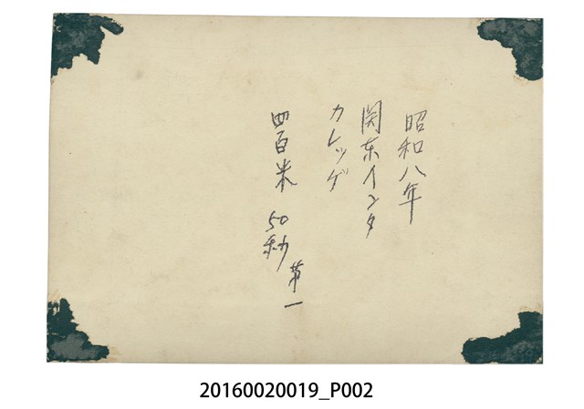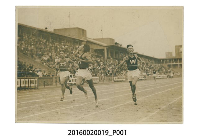 張星賢參加東京神宮體育場舉行的「關東大專對抗田徑賽大會」勇奪四百公尺第一名終點衝線照片