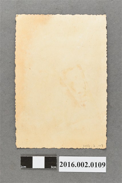 1.本件為一位身著軍裝的男士之黑白照片,約7.5x11.5公分直幅,留白花邊,原為張星賢收藏之相片,由其四子張昭平捐贈給臺灣歷史博物館。拍攝地點可能為照相館室內,地上鋪有花磚,後方背景繪有花瓶狀欄杆。影像中的男子身穿成套軍裝,頭戴有沿大盤帽,肩上斜背著配槍,雙手交疊於身體前方握著軍棍,雙眼神直視前方。2.張星賢(1910-1989)為臺灣田徑選手,出生於日治時期的臺中廳,曾留學於日本早稻田大學,1932年(昭和7年)代表日本參與洛杉磯奧運,為臺灣首位奧運選手,1948年(民國37年)回臺灣創立田徑協會,擔任首屆臺灣省田徑協會會長,並擔任總幹事達二十餘年,以教練身份培訓、指導新一代臺灣田徑選手,例如陳英郎、楊傳廣、紀政等人。