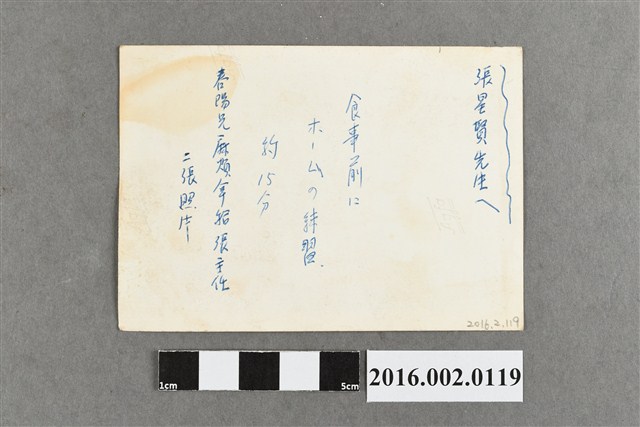 1.本件為外國桌球女選手在西德參賽練習之黑白照片,約7x10公分橫幅,留白邊,原為張星賢收藏之相片,由其四子張昭平捐贈給臺灣歷史博物館。照片表面有毀損痕跡,部分畫面難以辨識,依稀可見幾名短卷髮的西方面孔女性手持桌球拍揮動。照片背面寫有三段文字,可知此張照片為原所有者請託春陽兄給予張星賢,中間日文「食事前に ホームの練習 約15分鐘」,說明此張照片拍攝一群外國桌球女選手於用餐前做十五分鐘的家庭練習。2.張星賢(1910-1989)為臺灣田徑選手,出生於日治時期的臺中廳,曾留學於日本早稻田大學,1932年(昭和7年)代表日本參與洛杉磯奧運,為臺灣首位奧運選手,1948年(民國37年)回臺灣創立田徑協會,擔任首屆臺灣省田徑協會會長,並擔任總幹事達二十餘年,以教練身份培訓、指導新一代臺灣田徑選手,例如陳英郎、楊傳廣、紀政等人。