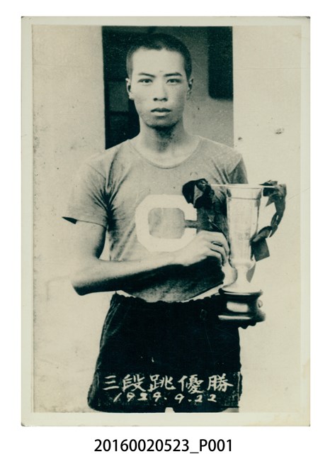 張星賢代表台中商業學校參加「建功神社田徑賽大會」勇奪三級跳遠第一名舉獎盃獨照