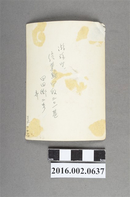 背面寫有"游彌堅 信義路四段201巷44街2號 弄"。游彌堅為戰後初期重要政治人物,為戰後初期臺北市長,同時也是教育體育界聞人。