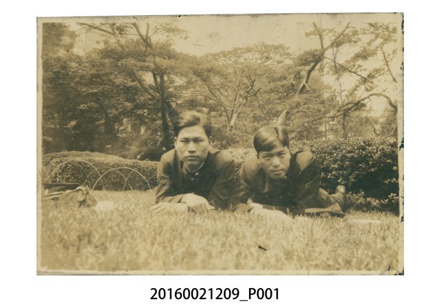 1.本件為張星賢就讀早稻田大學時期與同學合影之黑白照片,約8x5.5公分橫幅,留白邊,由張星賢四子張昭平捐贈給臺灣歷史博物館。張星賢位於畫面右方,與身旁的男性友人皆穿著深色立領長袖上衣與長褲,為日本常見制服樣式。張星賢與友人一起趴在草地上,雙手交疊將上半身撐起,視線望向鏡頭,兩人身後為弧形圍欄與低矮的灌木,灌木後方種有樹木。照片背面四周有從相簿撕下的黑色黏貼痕跡。2.張星賢(1910-1989)為臺灣田徑選手,出生於日治時期的臺中廳,曾留學於日本早稻田大學,1932年(昭和7年)代表日本參與洛杉磯奧運,為臺灣首位奧運選手,1948年(民國37年)回臺灣創立田徑協會,擔任首屆臺灣省田徑協會會長,並擔任總幹事達二十餘年,以教練身份培訓、指導新一代臺灣田徑選手,例如陳英郎、楊傳廣、紀政等人。