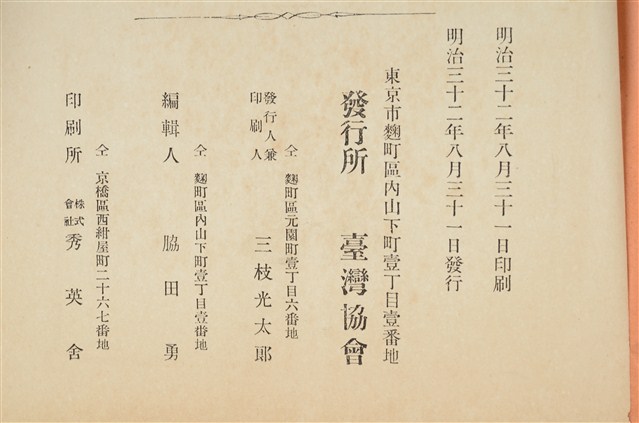 「臺灣協會」成立於1898年4月,其所成立之目的為組織一個有規模的「殖民研究」團體,並隨即於1898年10月發行機關刊物 《台灣協會會報》。本期內容有,論說 p1/台灣的經濟界/熱帶地風土馴化及衛生論/產業一斑 P52/台南縣殖民預定地/雜報 P60/雲林地方於ける匪況/三十三年度總督府預算/明治三十一年度於ける台灣外國貿易/台灣的新開港/台灣於ける教育現況/往來一則/本會記事 P65/正誤及追加/台灣支部第一次總會記事/本會評議員會/寄贈書目/時論一束 P72/水野運氏/台灣談/台灣自營的基甚遠/外數件