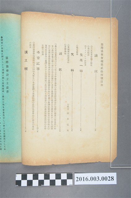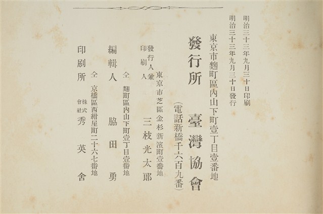 「臺灣協會」成立於1898年4月,其所成立之目的為組織一個有規模的「殖民研究」團體,並隨即於1898年10月發行機關刊物 《台灣協會會報》。本期內容有,論說 p1/三大世界帝國與殖民/南清航路/フイゾピゾ的世界/產業一斑 P19/瑞芳金山/漁業經濟/史料 P29/英國南阿特許會社/英領錫蘭/雜報 P35/台北監獄署概況/三十三年七月中台北氣候/樟腦賣捌保證金的完納/圓銀三拾参萬圓的始末/台灣事業公債的發行/全公債發行的次第/全總會に於ける柳生副頭取的演說/台灣樟腦局神戶出張所/台灣國語學校入學者/台灣總督