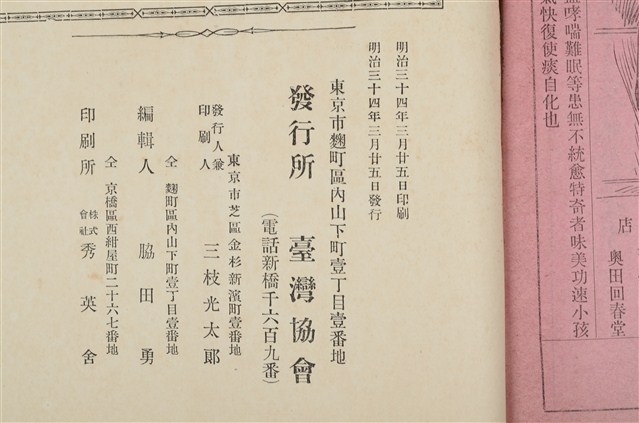 「臺灣協會」成立於1898年4月,其所成立之目的為組織一個有規模的「殖民研究」團體,並隨即於1898年10月發行機關刊物 《台灣協會會報》。本期內容有,論說 p1/台東殖民小策(承前)/佛國殖民得維持費/蘭領瓜哇/產業一斑 P9/台東殖產事業的目途/雜錄 P19/蕃情一斑/台灣街庄植樹に就て/熱帶植物的栽培に就て/訪問 P32/視辰巳氏/雜報 P35/一月的台灣各港的貿易/同各港に於ける汽船統計/台灣民刑事件數/台灣的寒氣/基隆港輸入的清酒/台東管內的金礦/台灣的石油礦/台灣銀行金塊賣收的景況/台灣銀行的