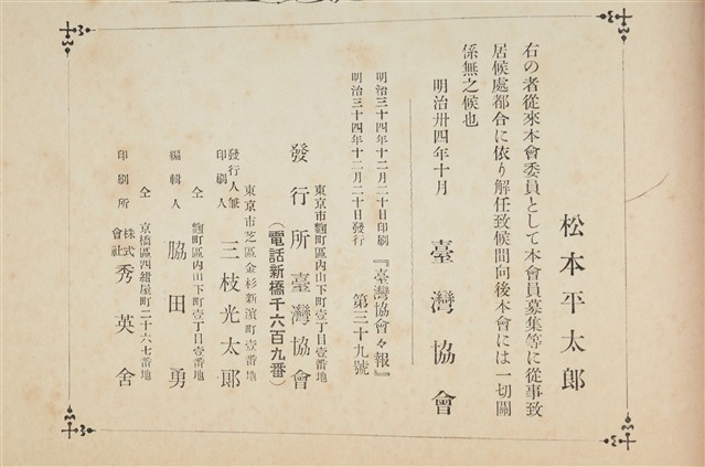 《臺灣協會會報》第39號明治34年12月20日