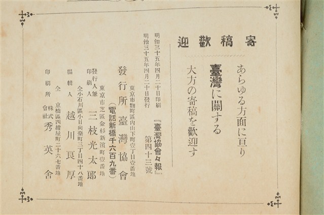 「臺灣協會」成立於1898年4月,其所成立之目的為組織一個有規模的「殖民研究」團體,並隨即於1898年10月發行機關刊物 《台灣協會會報》。本期內容有,論說/台灣的經濟界/台灣的經營與財政/產業/樟腦製造法改良的急務/罌粟栽培的利益/台灣南部的柑橘/雜錄/西伯利沿海州的殖民/日本統治下的台灣/台灣案內/雜報/台灣北部的礦業/本年度的台灣南清航海命令書/台灣對岸的海運業/去月中的台灣貿易/台灣南部砂糖的大輸送/萬國砂糖會議/樟腦價格維持的困難/台灣南部的凶/台灣南部的埤圳事業/台灣風氣國新的兆/台灣與博覽會