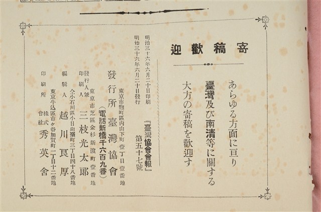 「臺灣協會」成立於1898年4月,其所成立之目的為組織一個有規模的「殖民研究」團體,並隨即於1898年10月發行機關刊物 《台灣協會會報》。本期內容有,論說/臺灣協會學校學生諸君に告ぐ 新渡戶稻造/歐米見聞談 中村是公/基隆の築港 長尾半平/產業/臺灣館の出品/臺灣行の綿布/苗栗出礦坑の採油事業/臺灣樟腦專賣の實况/雜錄/臺灣に於ける劉銘傳/臺灣案內 紅石/雜報/基隆築港否認の損害/臺灣縱貫鐵道と追加豫算/臺灣土地調查の完成期/臺灣百斯篤の全滅期/マニラの砂糖製造業の狀況/臺灣に於ける內地及對岸木材輸入の