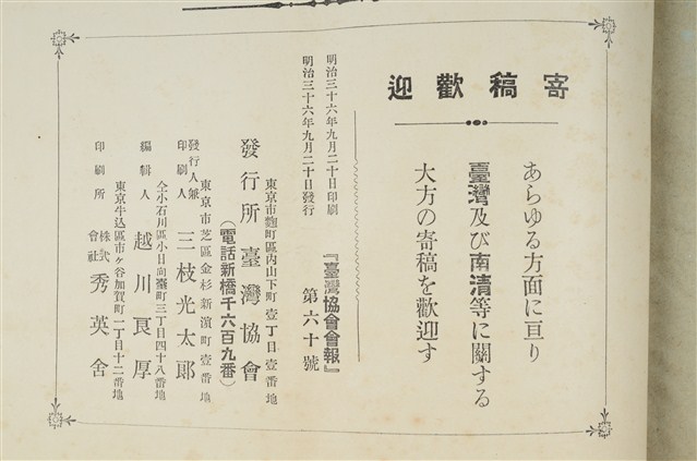 「臺灣協會」成立於1898年4月,其所成立之目的為組織一個有規模的「殖民研究」團體,並隨即於1898年10月發行機關刊物 《台灣協會會報》。本期內容有,論說/臺灣の經濟事情 柳生一義/臺灣財政辯妄 祝辰已/產業/新興製糖合股會社補助金の下附並概況/鳳梨業の製紙試驗/北部臺灣の製藍業/雜錄/佛國植民政策/臺灣舊時の法律(舊慣調查會報告)/臺灣の嫁娶 高砂翁/臺灣案內 紅石/雜報/ 臺灣幣制改革問題/臺灣の牧畜/臺灣阿片制度の好評/歸順土匪の消滅/中部臺灣の狀况/第四回の暴風雨/阿里山森林の真價/.臺灣縱貫鐵
