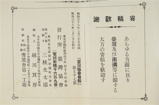 「臺灣協會」成立於1898年4月,其所成立之目的為組織一個有規模的「殖民研究」團體,並隨即於1898年10月發行機關刊物 《台灣協會會報》。本期內容有,論說/臺灣貨幣制度沿革 祝辰巳/臺灣の獄政 手島冰次郎/產業/臺灣經濟界に於けろ日露戰爭の影響 臺灣支部/卅七年臺灣茶況 大庭永成/雜錄/南清事情(其八) 梧堂/臺灣の大租/雜報/臺灣幣制改革の狀況/改正臺灣航路の概要/臺灣縱貫鐵道/臺灣の產金高/臺灣の森林/阿片吸食特許者數等/法令/會報/臺灣協會專門學校講演會/同校艇庫新設等/漢文/現時之文明