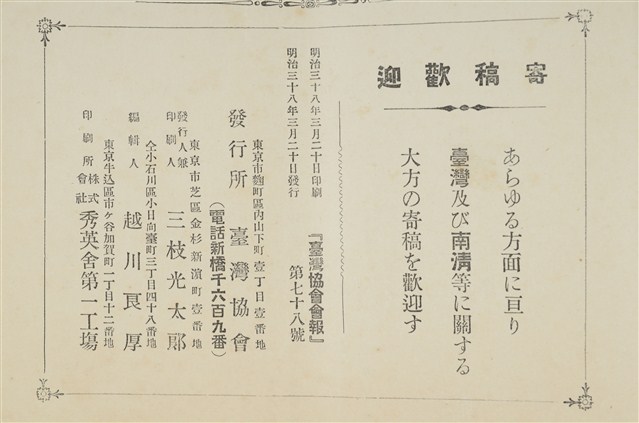 「臺灣協會」成立於1898年4月,其所成立之目的為組織一個有規模的「殖民研究」團體,並隨即於1898年10月發行機關刊物 《台灣協會會報》。本期內容有,論說/旅順口土產 志賀重昂/臺灣の獄政 手島兵次郎/產業/臺灣に於けろ日露戰爭の影響 臺灣支部/安平港に於けろ時局の影響 臺灣支部/南清に於けろ日本燐寸/雜錄/臺灣の大租/太古日本と南洋 原世外/雜報/臺灣流通貨幣の現狀/縱貫鐵道開通期/臺灣糖の當季豫想高/韓國に於けろ臺灣鹽/赤十字臺灣支部病院の開院/臺灣人の銀行業/臺灣北部の開墾計畫等/法令/