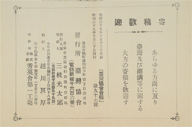 「臺灣協會」成立於1898年4月,其所成立之目的為組織一個有規模的「殖民研究」團體,並隨即於1898年10月發行機關刊物 《台灣協會會報》。本期內容有,論說/恒春の鯨 臺灣支部/彰化廳員林地方の柑橘栽培 臺灣支部/雜錄/兒玉總督治臺小史 伊能嘉矩/雜報/臺灣上半期の金融/臺灣糖業獎勵の效果/臺灣土地總價額/臺南の內地人商業/阿里山の近情/臺灣彩票發行狀况/東洋製糖會社の創立/五二共進會の臺灣出品と喫茶店/後藤男の入京/校報/門田幹事の渡韓/講師移動/校友消息/山田氏通信/劍道部記事/語學部記事/漢文/現時