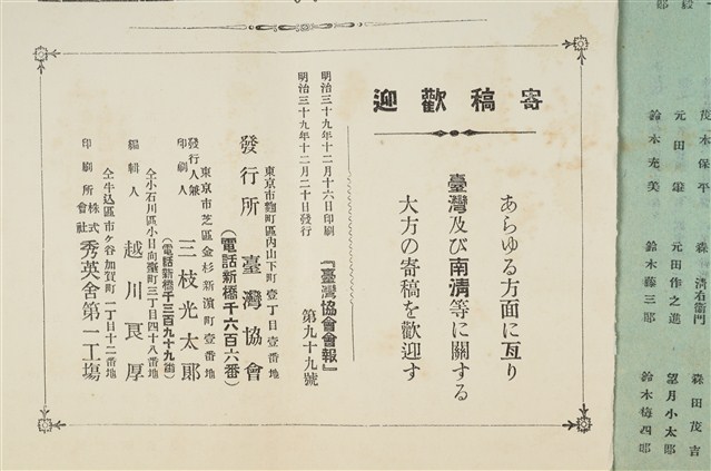 「臺灣協會」成立於1898年4月,其所成立之目的為組織一個有規模的「殖民研究」團體,並隨即於1898年10月發行機關刊物 《台灣協會會報》。本期內容有,論說/韓國韓國瞥見談(完結) 門田正經/產業/臺灣石炭の前途/雜錄/臺灣の土蕃に見らるる火の智識 伊能嘉矩/雜報/臺灣總督府豫算/臺灣鐵道費/韓國の臺灣鹽/臺灣製糖資本劇增/臺灣の交通機關/葉製樟腦の利益/臺灣富籤に就て/臺灣經度の觀測/宜蘭大埤圳の起工/臺灣顧問の權能/臺灣館の決定/祝長官の歸朝と渡臺/會報/震災義捐に對する民政長官よりの通告/校報/安東