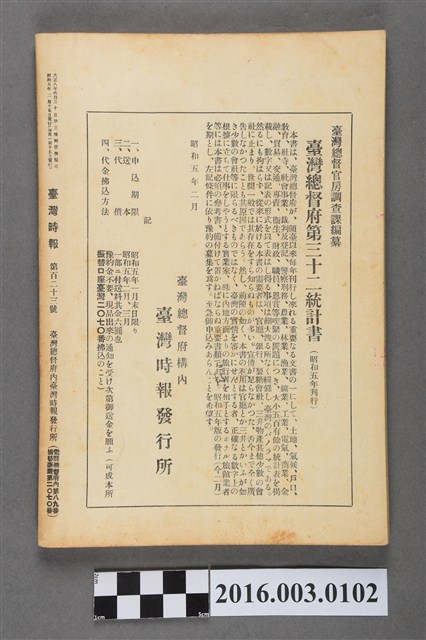 《台灣時報》是日治時期台灣總督府所發行之日語機關雜誌,內容包含當時台灣的政治、產業、農業、貿易、交通、軍事、教育、司法、警察、土木、技術、工藝、文藝等之論文及統計資料,同時並收錄當時在台知名的日本作家之俳句、詩、小說,為研究台灣日治時期之重要史料。