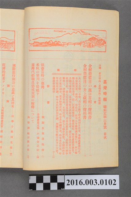 本期內容有,新竹市街,嘉義市街,金解禁"/金解禁當日の濱口首相の聲明書/金解禁當日の井上藏相の聲明書/大正天皇御三年祭/高松宮殿下御成婚期日決定/帝國議會開院式/金解禁實施/政納式/昭和五年國勢調查施行令/阿片癮矯正所規程公布/第二回產糖予想/國債總額/臨時產