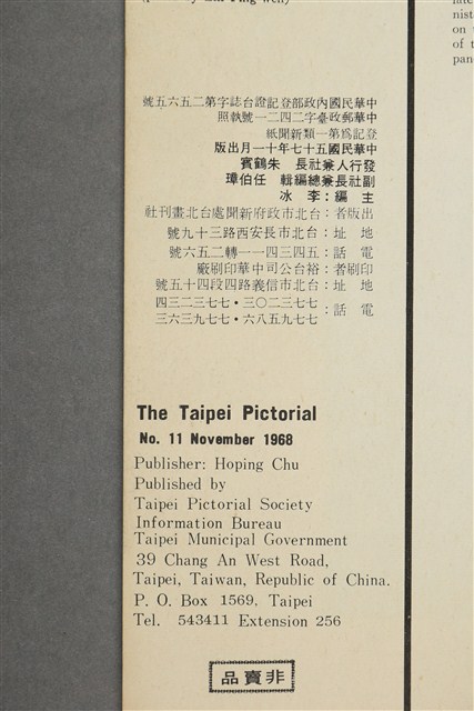《臺北畫刊》為臺北市政府觀光傳播局出版的市政刊物,以圖文並茂的內容傳達臺北市的市政資訊、生活型態及與市民習習相關的實用資訊。《臺北畫刊》 (第11期)民國57年目錄/一月要聞 /反攻在望.人壽.年豐--全民歡慶光輝十月/兆民歡欣鼓舞恭祝元首萬壽/復興中華文化 舉辦首屆全國圖書雜誌展覽/多彩多姿二屆市運大會 徐執中/紀政小姐為國爭光、萬里天外載譽歸來/以最高崇敬虔誠,用禮樂佾舞與詩歌來讚頌孔子的偉大!/祭孔釋奠大典樂舞的改進/紮了雙辮的女孩 田原