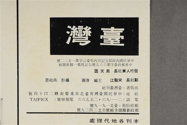 《臺灣》畫刊是臺灣省政府新聞處出版的刊物,以圖文並茂的內容傳達臺灣省的省政資訊、生活型態及與省民習習相關的實用資訊。臺灣畫刊社出版《臺灣》民國57年4月目錄/每月新聞剪輯/本省第一批平價住宅落成/臺灣林相改良工作的成果/我國一次具有歷史意義的郵展/中國文字的書寫藝術/臺灣春秋/蔡安邦養雉記/中非農業技術合作的新里程碑/心長集/驚險刺激的機車競賽/多彩多姿的第四屆亞洲印刷會議及其展覽會