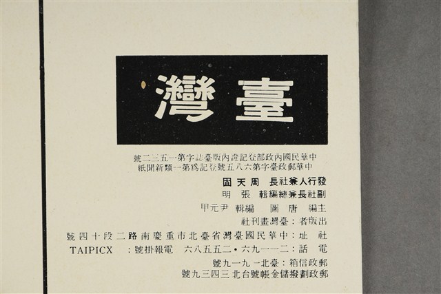 《臺灣》畫刊是臺灣省政府新聞處出版的刊物,以圖文並茂的內容傳達臺灣省的省政資訊、生活型態及與省民習習相關的實用資訊。臺灣畫刊社出版《臺灣》民國58年9月目錄/揚威世界棒壇/臺省民主最高議壇環抱山水中/陳大慶主席巡視曾文水庫工程/臺製女籃隊介紹/明志工專工業設計展/龜山島的神話/近海吃海鮮臺灣是天堂/廖未林的藝術世界/人類進窺月球/氣勢壯觀的觀音山/漢畫(下)