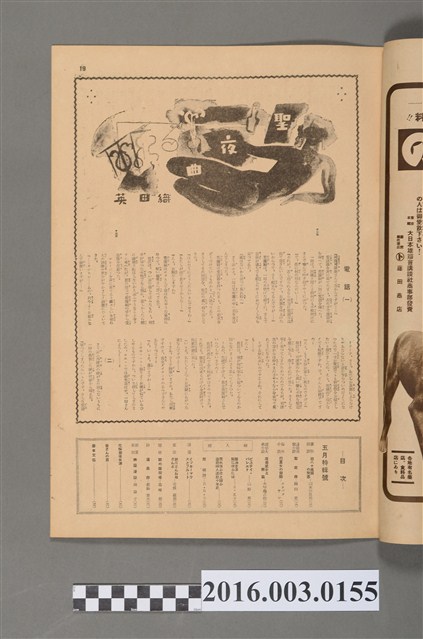 臺日グラフ是由台灣日日新報在1930年10月1日刊行,主要是以文學作品、文物描述介紹臺日文化內涵,此期刊目前在台灣典藏狀況,以台灣歷史博物館最為完整。本號內容有,本期目次/書物綺譚 百八十萬圓の聖書 山本奈良男(二三)/連載長篇小說 聖夜曲 織田英(一九)/海外小說 巴里女の冒險 モオパツサン(二六)/讚切大眾小說 直垂武士と橫笛 水守龜之助(三三)/婦人欄 ビユテイ・パレエド 山野昇(二八);髮油を洋 髮に使ふには S・K子(二八);荒れ狂ふ波と關ふ 臺灣婦人運動十年史;默禱(詩)R・R・R(二九)/漫