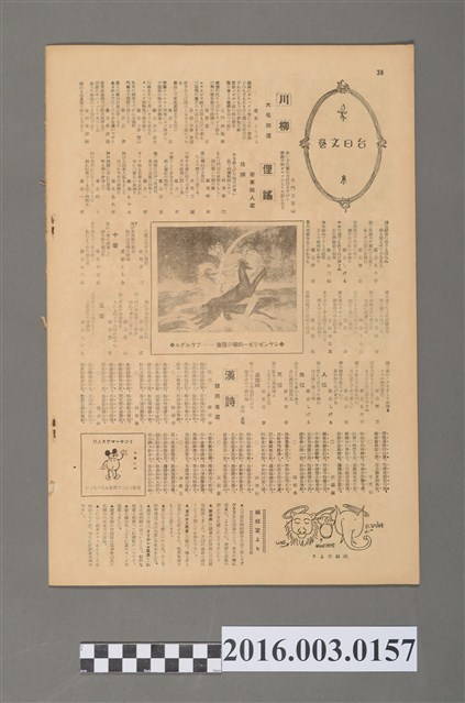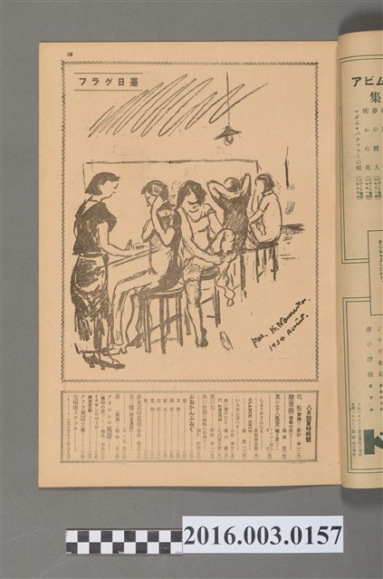 臺日グラフ是由台灣日日新報在1930年10月1日刊行,主要是以文學作品、文物描述介紹臺日文化內涵,此期刊目前在台灣典藏狀況,以台灣歷史博物館最為完整。本號內容有本期目次/化粧(扉繪)野村幸一(一九)/聖夜曲(連載小說)織田英(二O)/夏の女人風景(繪ど文)アルカン同人合作/しようがさんによ 宮田彌太郎(二四)/GLANCE, ONLY麓鹿二(二四)/いろはにほへど 小島泰介(二五)/白い俤のひど 西川滿(二六)/L'AMOUR 北川原幸朋(二六)/夏の女 野村幸一(二六)/水の世界(趣味の科學) 羽仁定平