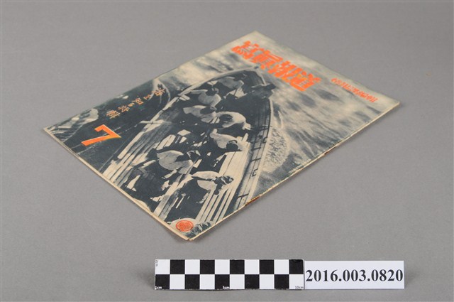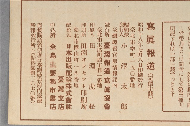 1.此物件為昭和18年7月8日發行的《寫真報道》,由臺灣總督府情報課編輯,編輯及發行人為小澤太郎,由臺灣報導寫真協會發行,內容主要利用大量的相片紀錄當時日本與各國的戰爭紀錄及臺灣本島之事,再輔以文字加以說明,例如此次刊物內容有海軍志願兵招募要點、日本國軍艦實力演進、造船狀況、水產學校學生訓練情形、海軍訓練情形、北京打鬼習俗新聞……等。