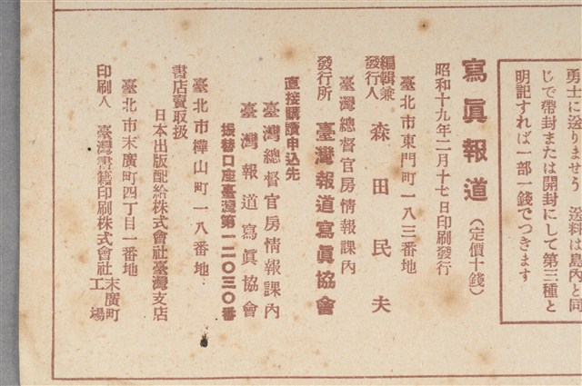 1.此物件為昭和19年2月17日發行的《寫真報道》,由臺灣總督府情報課編輯,編輯及發行人為森田民夫,由臺灣報導寫真協會發行,內容主要利用大量的相片紀錄當時日本與各國的戰爭紀錄及臺灣本島之事,再輔以文字加以說明,例如此次刊物內容有新竹州苗栗街女子青年隊在神社祈求戰爭勝利、女性代替男性進入職場、各地女性投入生產行列、日本赤十字社看護婦報導……等。