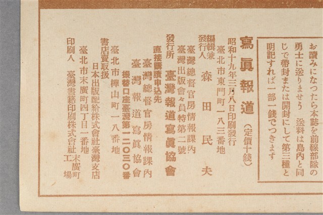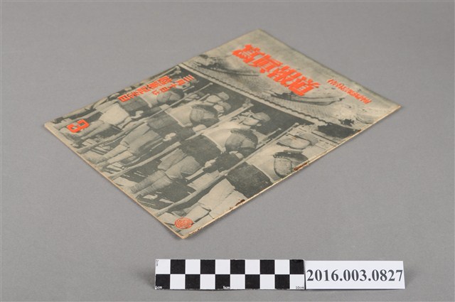 1.此物件為昭和19年3月10日發行的《寫真報道》,由臺灣總督府情報課編輯,編輯及發行人為森田民夫,由臺灣報導寫真協會發行,內容主要利用大量的相片紀錄當時日本與各國的戰爭紀錄及臺灣本島之事,再輔以文字加以說明,例如此次刊物內容有戰爭前線報導、陸軍通信兵報導、富士山山腳下戰技訓練、北軍學生聯合演習情形、慰問信與慰問物件送達前線、防空演習情況……等。