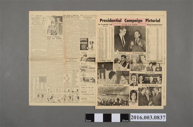 1.此物件為民國49年(1960)11月9日的《英文中國郵報》,此份報刊除刊登中華民國國內新聞外,尚有刊登國際大事,亦有提供廣告張貼空間,如此日報導便有「美國退出西印度基地」、「約翰·甘迺迪與林登·貝恩斯·詹森為總統大選獲勝組合」等國際大事。