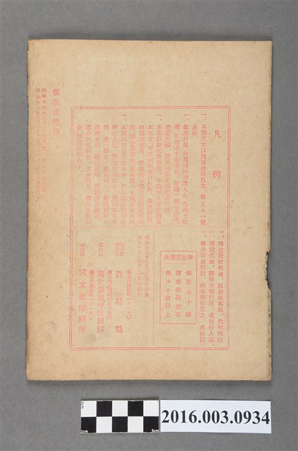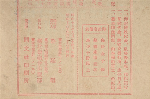 1.此物件為《崇聖道德報》月刊第53號,於昭和18年(1943)9月28日發行,編輯兼發行人為許廷魁,發行所為臺北崇聖會出版部,此刊以講述道德、儒學為主,例如此次內容便有:「孔聖為宇宙救世主(三)」、「聖門傳記(五)」、「帝國文化之發(十)」、「忠魂毅魄諸勇士」、「救人則救己」、「免飢延壽」、「不孝天誅」…….內容。