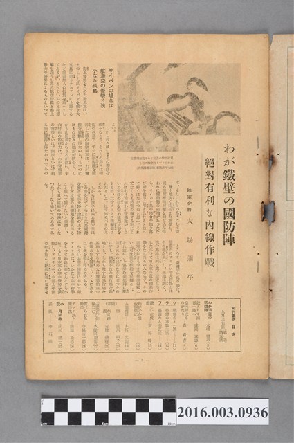 1.此物件為《台新》旬刊第一卷第五號,為九月上旬號,此物件無出版頁,故發行人與發行日期不詳,只得發行所為臺灣新報社,此刊內容主要以戰爭時事報導為主,此次內容有「わが鐵壁の國防陣」、「待望的軍隊生活」、「臺灣的人形芝居」、「戰慄的V一號」……等篇章。