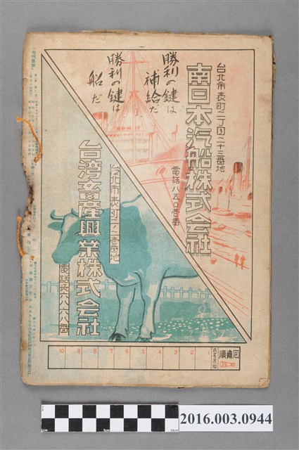 2. 《台新》旬刊為日治末期發行的刊物,創刊於昭和19年(1944)7月,是一份以時事報導與分析的雜誌,由於當時仍屬於二戰時期,遂大部分內容都與戰事相關,如「前線的飲食」、「戰爭與科學」、「空襲下的娛樂」、「戰地寫真」等篇章,在廣告部分又可常見「必