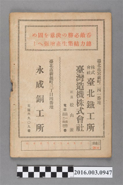 2. 《台新》旬刊為日治末期發行的刊物,創刊於昭和19年(1944)7月,是一份以時事報導與分析的雜誌,由於當時仍屬於二戰時期,遂大部分內容都與戰事相關,如「前線的飲食」、「戰爭與科學」、「空襲下的娛樂」、「戰地寫真」等篇章,在廣告部分又可常
