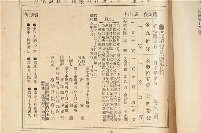 昭和5年6月1日《台法月報》出版的第24卷第6號,其內容大致包括本島の慣習上に於ける分戶の要件に就て//統計/臺法俳壇/臺法月報質疑用紙/質疑問答/名譽毀損被告事件/家賃請求事件/永小作權設定登記抹消竝土地引渡請求事件/土地引渡並家屋取除請求事件/贈與ニ因ル所有權移轉登記手續請求等。《台法月報》於明治38年6月發行,至明治39年11月共發行了17冊,爾後更名為《法院院報》,發行44冊,在明治44年又再度恢復《台法月報》之名,至昭和18年共發行443冊。《台法月報》主要為記錄當時法令的頒布動態外,也有法院