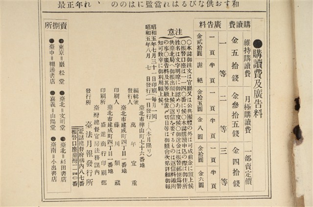 昭和5年8月7日出版的《台法月報》第24卷第8號內容大致包括臺灣の土地制/文化刑法における教育刑の意義/臺灣に於ける夫妾制度と之に伴ふ効果に就て / 彙報/辭令/統計/臺法俳壇/受贈書目/臺法月報質疑用紙/質疑應答/判例/判例研究。《台法月報》於明治38年6月發行,至明治39年11月共發行了17冊,爾後更名為《法院院報》,發行44冊,在明治44年又再度恢復《台法月報》之名,至昭和18年共發行443冊。《台法月報》主要為記錄當時法令的頒布動態外,也有法院判決例,且每冊有時人所寫的雜報、雜錄、訴訟叢談,可反