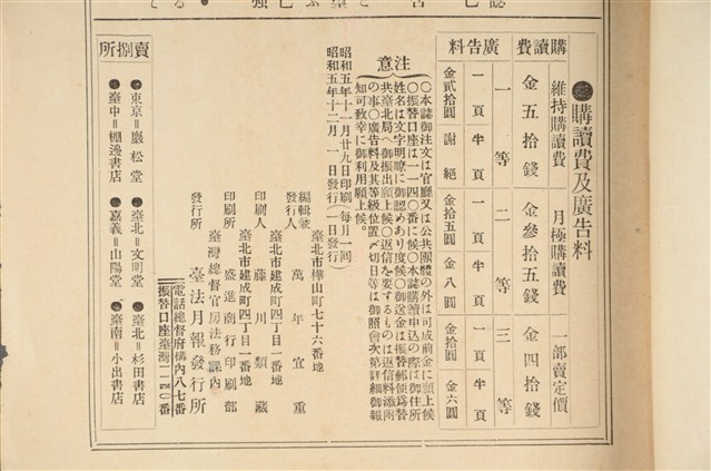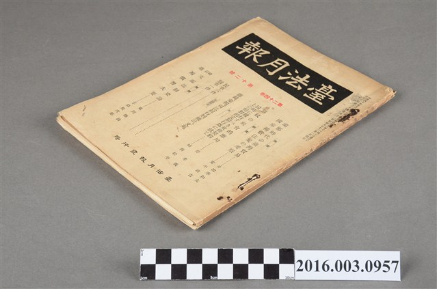 昭和5年12月1日出版的《台法月報》第24卷第12號,其內容大致包括蘭鄭時代の臺灣貿易/國家補償法案の考察/同時に履行すべき双務契約上の相對的定期行為に就て/民事訴訟法第六百五十六條は競賣法に依る競賣に準用なしとする判例/彙報/統計/臺法俳壇/臺法月報質疑用紙/質疑應答/附錄[校訂支那法制史論]/附錄[臺灣慣習大要]/第二編人事[臺灣慣習大要] 。《台法月報》於明治38年6月發行,至明治39年11月共發行了17冊,爾後更名為《法院院報》,發行44冊,在明治44年又再度恢復《台法月報》之名,至昭和18年共
