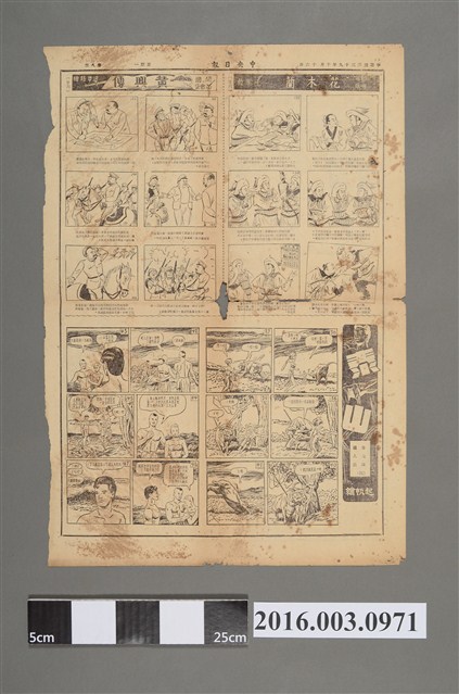 此份文物為1950年10月16日的《中央日報漫畫半週刊》,共有三則漫畫,分別是長連載的〈花木蘭〉、〈黃興傳〉與〈泰山〉。從漫畫的類型能看出當時群眾對於愛國情懷的重視。